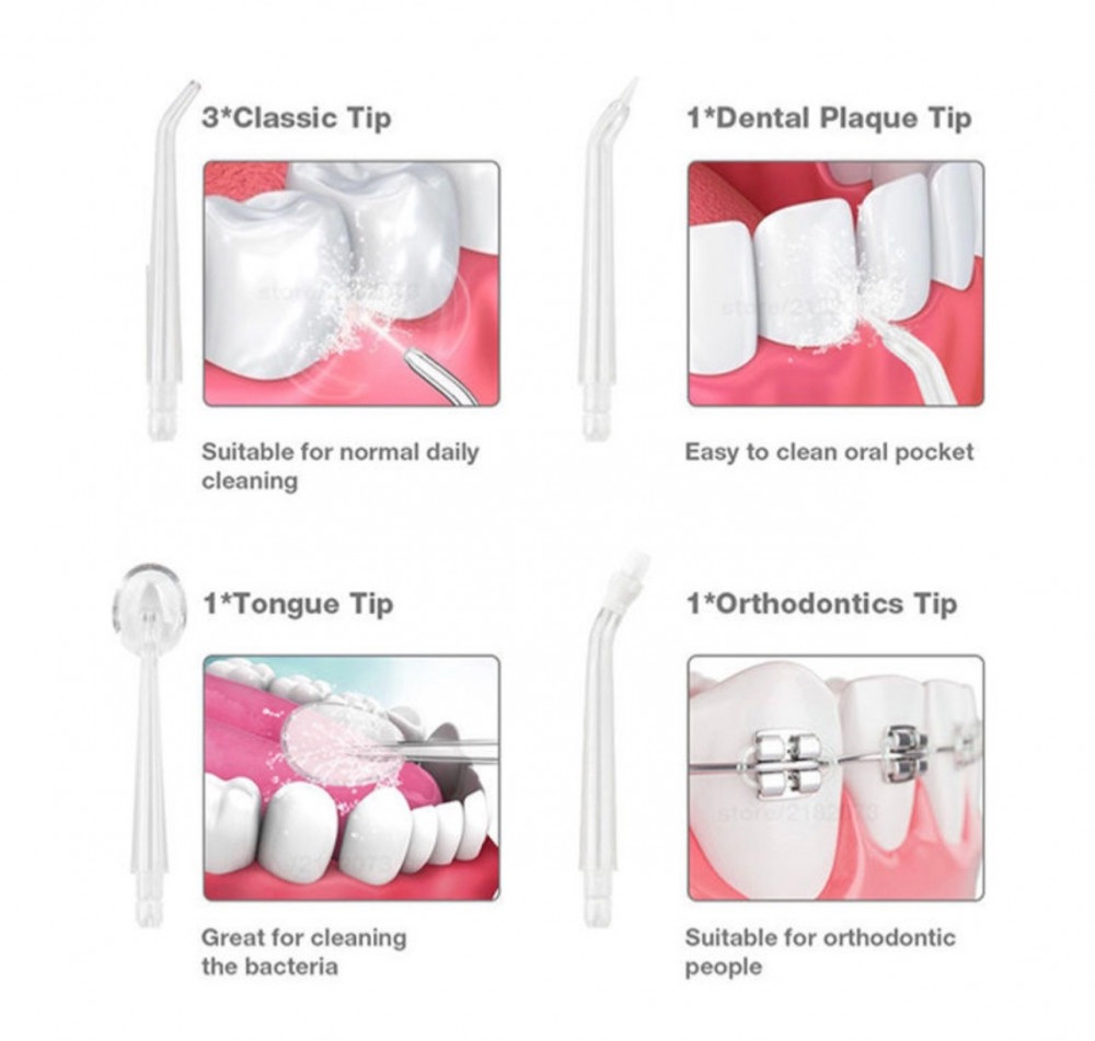 الرؤوس المختلفة 4 : 1رأس كلاسيكي 2 رأس كشط اللسان 3 رأس لإزالة الجير 4 رأس لتنظيف تقويم الأسنان