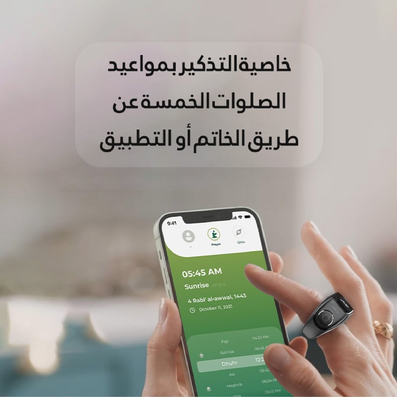 - هو أول خاتم ذكي في العالم للتسبيح، مصمم ليساعد في تلبية حاجتنا اليومية في التسبيح وتذكيرنا بمواعيد الصلاة يومياً، فهو بديل للمسابح اليدوية بتجربة تكنلوجية في غاية الروعة على شكل خاتم يمكن ارتداءه.