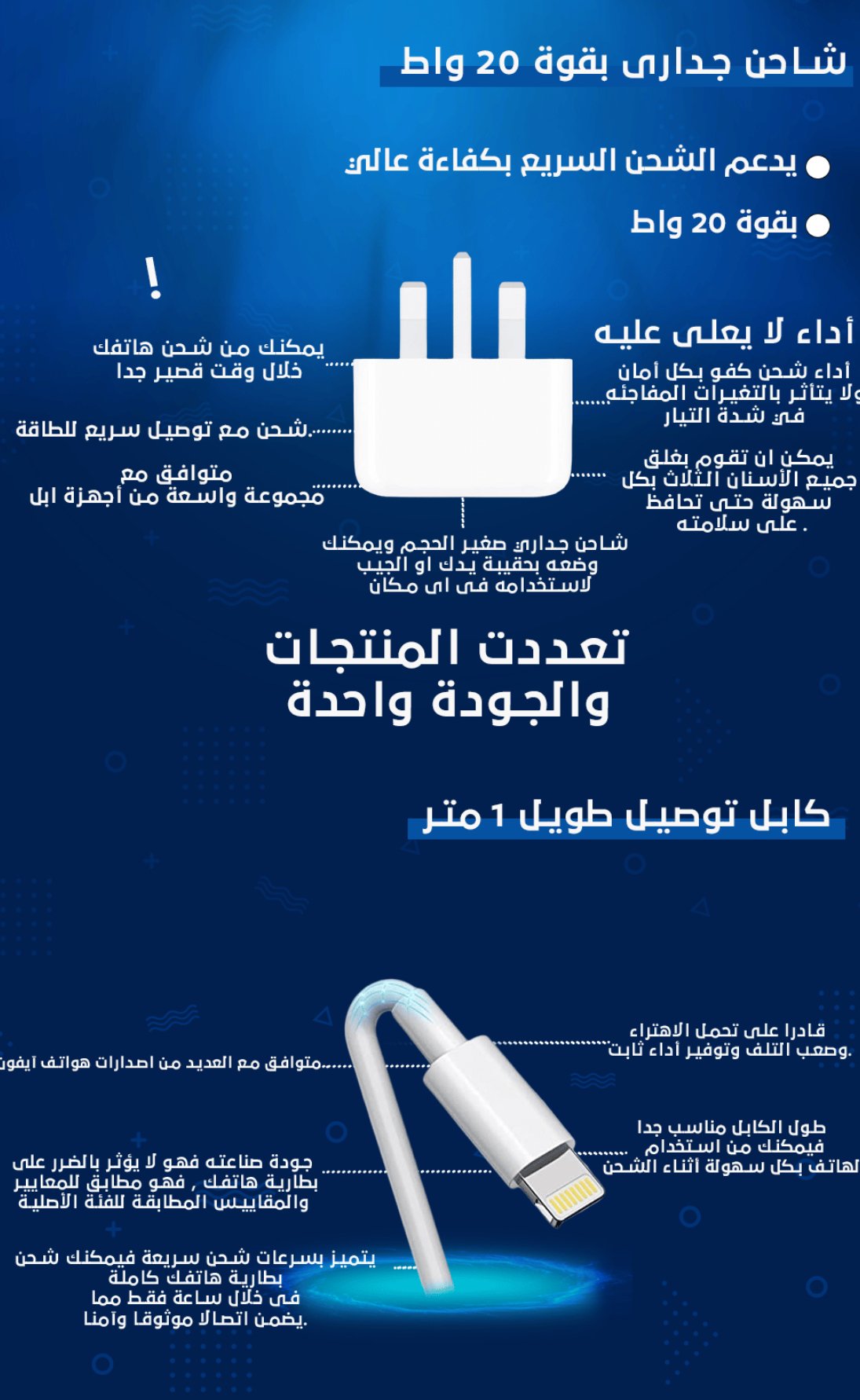 يحتوي بكج ايفون هذا على شاحنين جداريين بقوة 20 واط يدعمان تقنية الشحن السريع، مما يتيح لك شحن هاتفك بسرعة كبيرة، وهذه الميزة لا تقتصر على توفير الوقت فحسب بل تضمن أيضًا أن يكون هاتفك جاهزًا للاستخدام في أي وقت تحتاجه فيه.