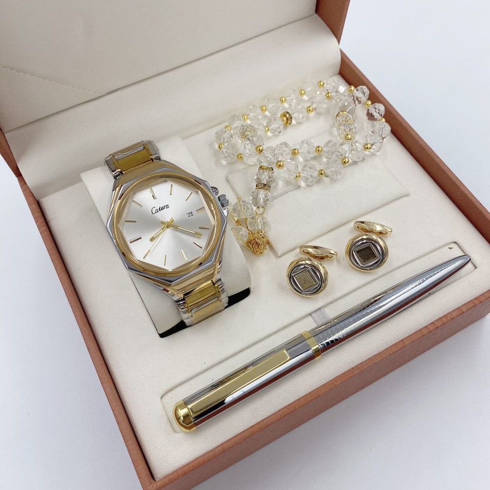 ساعة رجالية من ماركة كاتيرا catera بسير باللون الذهبي و الفضي وتتميز الساعة بالميناء الواسع باللون الابيض