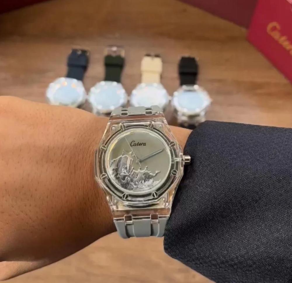 - تصميم عصري: السوار الشفاف واللون الرمادي يمنحان الساعة لمسة حديثة وأنيقة.